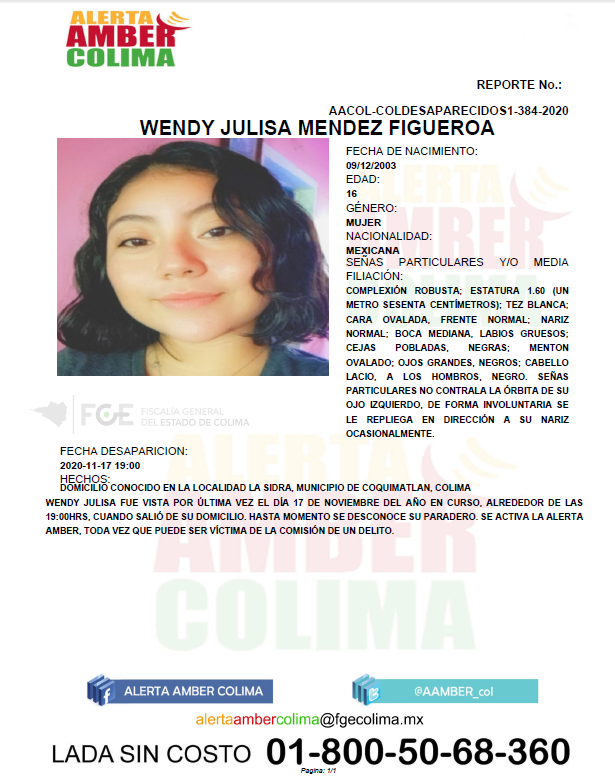 Colima, México, Avanzada (17/01/2021).- Wendy Julisa Mendez Figueroa tiene 17 años de edad, y desapareció el 17 de noviembre de 2020, cuando aún tenía 16 años, el 9 de diciembre cumplió años.