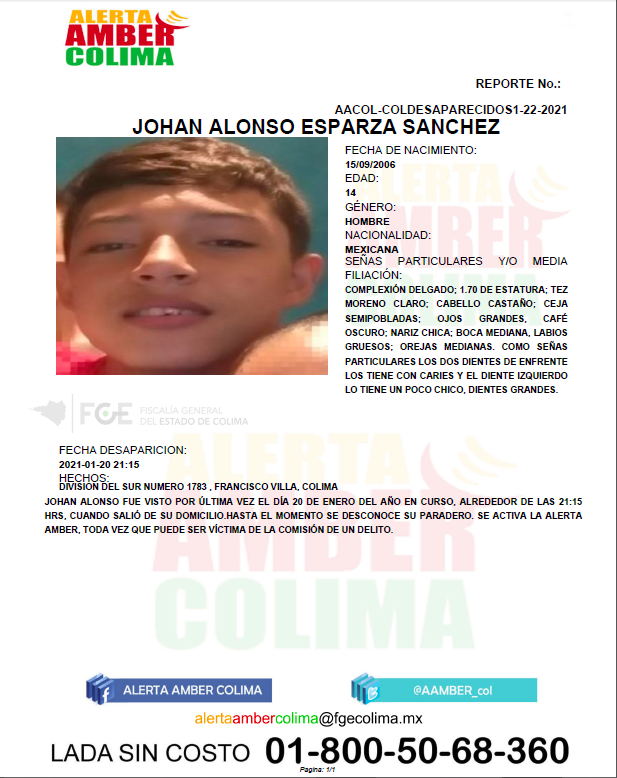 Colima, México, Avanzada (23/01/2021).- Johan Alonso Esparza Sánchez tiene 14 años de edad, las autoridades activan la Alerta Amber bajo la presunción de que puede ser víctima de la comisión de algún delito.