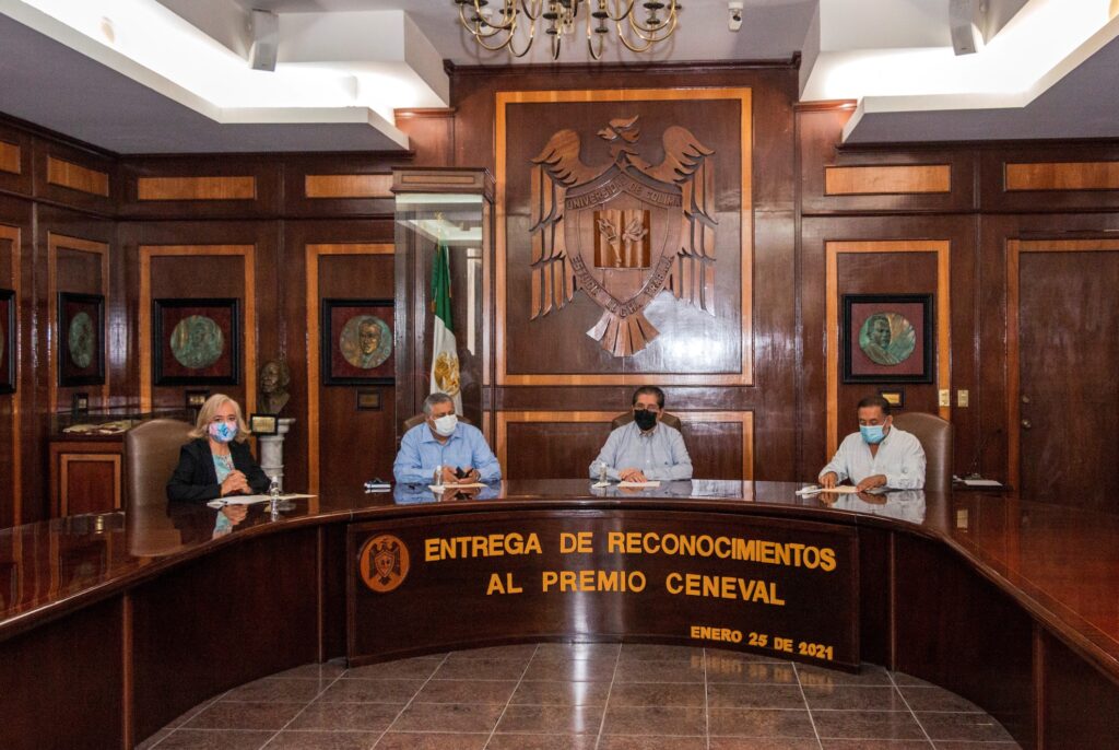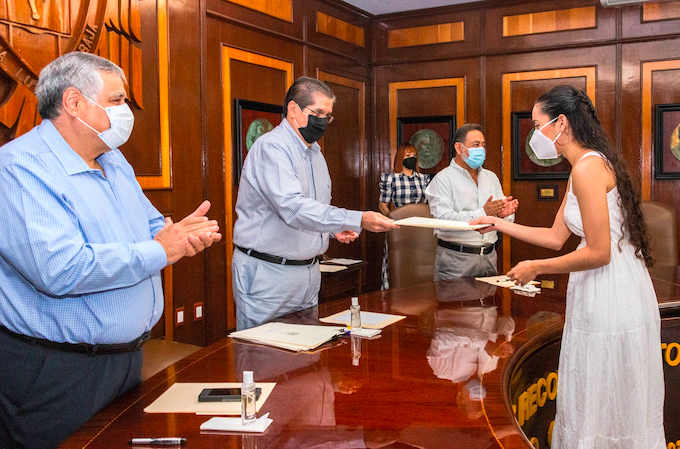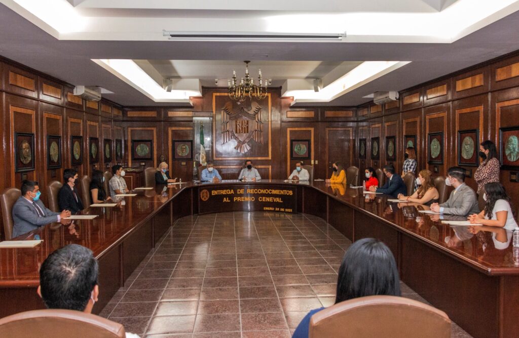 Colima, México, Comunicado (26/01/2021).- En evento realizado este lunes en la sala de juntas de rectoría, 16 egresados de la Universidad de Colima recibieron de manos del rector, José Eduardo Hernández Nava, el Premio CENEVAL al Desempeño de Excelencia en el Examen General para el Egreso de la Licenciatura (EGEL), por sus notas sobresalientes en esta prueba.