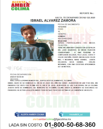 La Fiscalía General del Estado de Colima activó la Alerta Amber bajo la presunción de que podría ser víctima de la comisión de algún delito. Cumplió seis meses desaparecido.