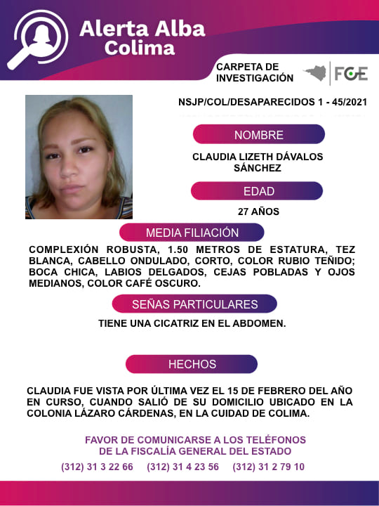 Colima, México, Avanzada (16/02/2021).- Claudia Lizeth Dávalos Sánchez tiene 27 años de edad y fue vista por última vez el 15 de febrero de 2021 cuando salió de su domicilio ubicado en la colonia Lázaro Cárdenas, en la ciudad de Colima.