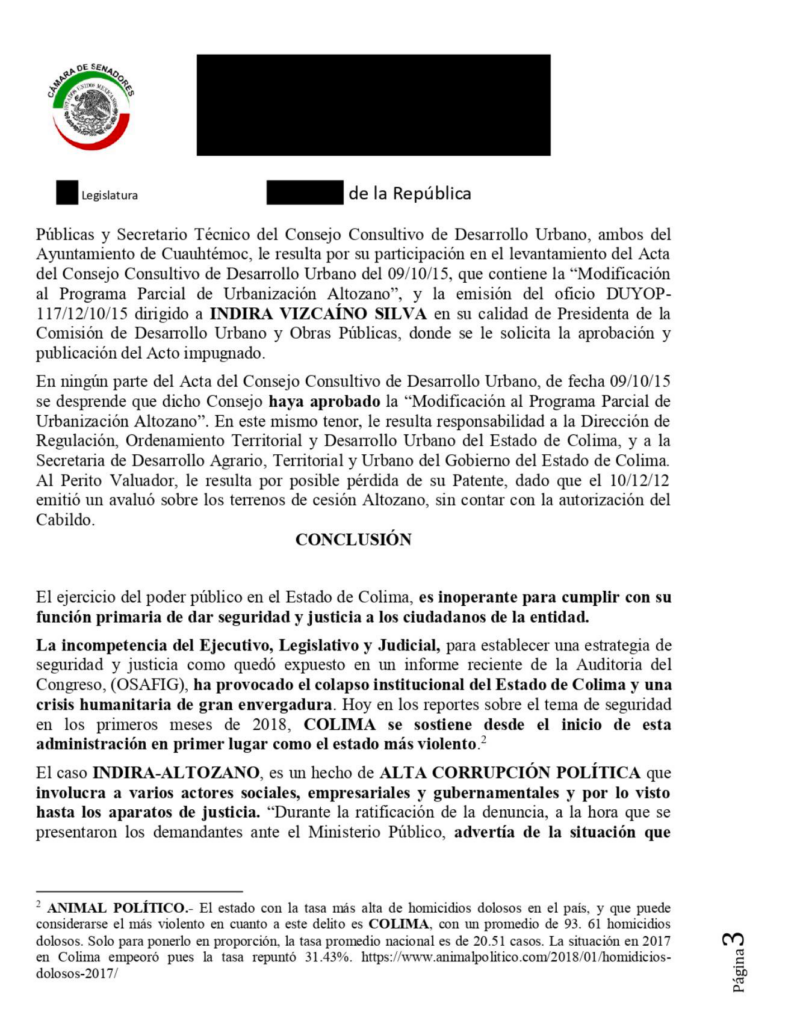 En el recorrido casa por casa para integrar el padrón electoral para la elección de gobernador en 2015, por encargo de la dirigencia de morena, otrora en formación, recogí una demanda de justicia para reintegrar un desvío millonario que afectaba, y afecta la Hacienda Pública del municipio de Cuauhtémoc, Colima. Se trata del caso ALTOZANO-INDIRA VIZCAINO, así con mayúsculas por lo que implica.