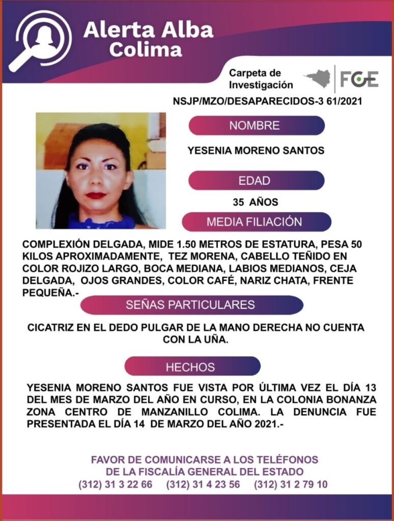 Colima, México, Avanzada (15/03/2021).- Yesenia Moreno Santos tiene 35 años de edad y fue vista por última vez el día 13 de marzo de 2021, en la colonia Bonanza, en la Zona Centro de Manzanillo.