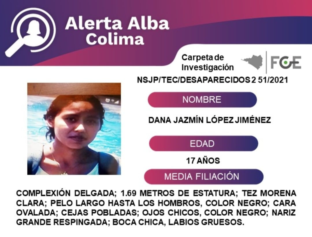 Colima, México, Avanzada (03/04/2021).- La Fiscalía General del Estado de Colima activó el protocolo de Alerta Alba por la desaparición de Dana Jazmín López Jiménez, fue vista por última vez el día 31 de marzo de 2021 en su domicilio en la colonia San José, en la ciudad de Tecomán, Colima.