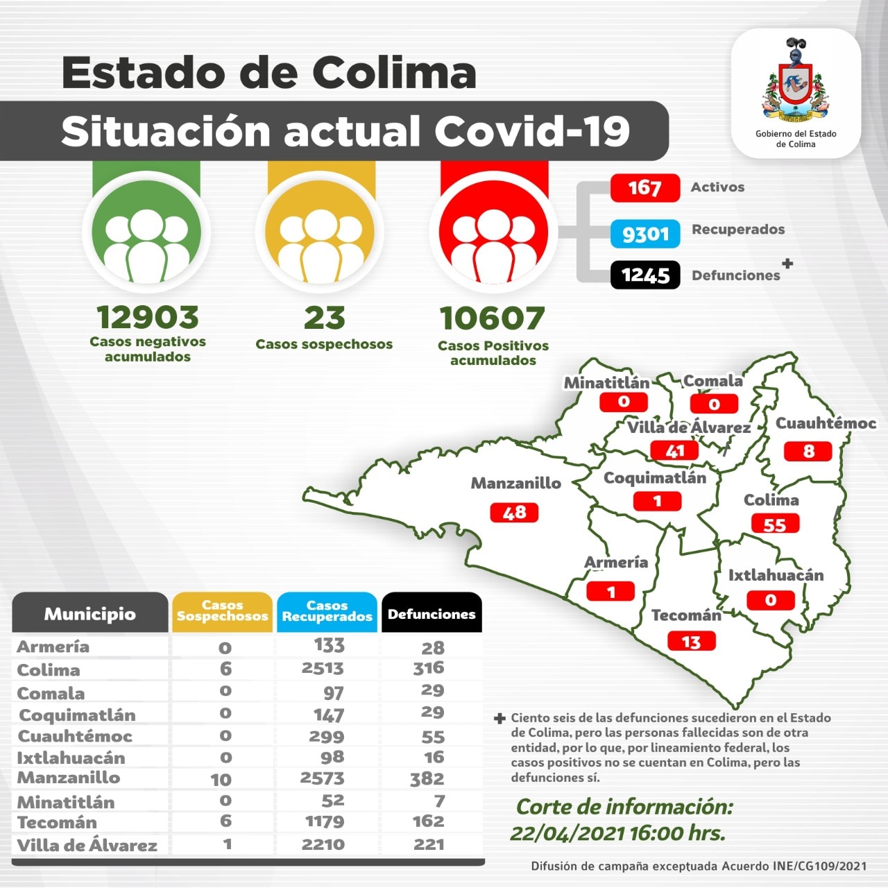 Por su parte, el municipio de Cuauhtémoc contabiliza 55 fallecimientos relacionados con el Covid-19 y 15 de letalidad; Comala con 29 muertes alcanza 23 de letalidad; Coquimatlán con 29 tiene 16; Armería con 28 tiene 17; Ixtlahuacán con 16 suma 14, y Minatitlán con 7 decesos promedia 12 de letalidad.