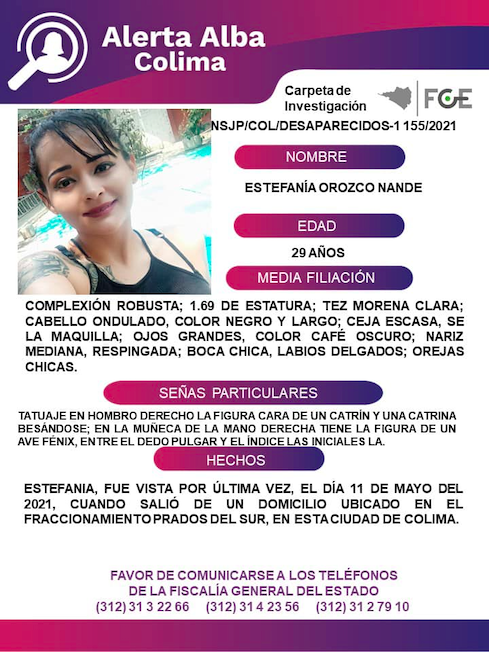 Colima, México, Avanzada (11/05/2021).- La Fiscalía General del Estado de Colima activó el protocolo Alerta Alba por la desaparición de Estefanía Orozco Nande, tiene 29 años de edad y fue vista por última vez el día 11 de mayo de 2021, cuando salió de un domicilio ubicado en el fraccionamiento Prados del Sur, en la ciudad de Colima.