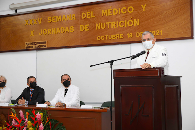 En su intervención, el Dr, José Enrique Barrios Navarro, director de la Facultad de Medicina, dijo que con esa inauguración iniciaban oficialmente las actividades presenciales del plantel, atendiendo siempre el protocolo de salud COVID-19, y que dicha semana tenía como objetivo promover la adquisición de nuevos conocimientos para la prevención, diagnóstico y tratamiento de los problemas de salud que más afectan a la sociedad, así como el gusto por las actividades culturales.