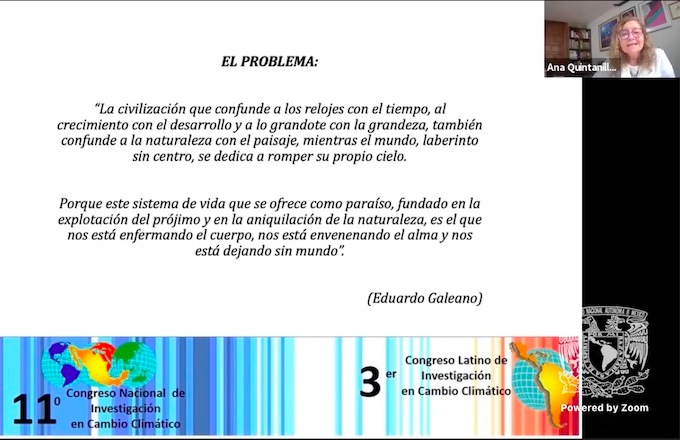 En su conferencia, Ana Luz Quintanillacomentó que “se puede hablar mucho sobre bajar las emisiones de gases de efecto invernadero, pero en realidad lo que requerimos son soluciones sistémicas, no aisladas, y para ello se requiere que los países prioricen los estudios interdisciplinarios y que éstos lleguen al sistema de gestión en la política”.