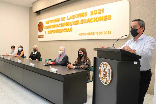 Colima, México, Avanzada (11/11/2021).- Al término de la primera de dos jornadas de trabajo, en las que rendirán su informe de labores las coordinaciones generales de Docencia, Investigación y Extensión, las cinco delegaciones universitarias y la Dirección General de Relaciones Internacionales y Cooperación Académica, el rector de la Universidad de Colima, Dr. Christian Jorge Torres Orriz Zermeño pidió a todas y todos los funcionarios reunidos en el auditorio de la Facultad de Psicología del campus central, “que nos veamos y entendamos de manera transversal, colaborativa y horizontal, no vertical, para no duplicar esfuerzos y lograr mejor los objetivos institucionales”.