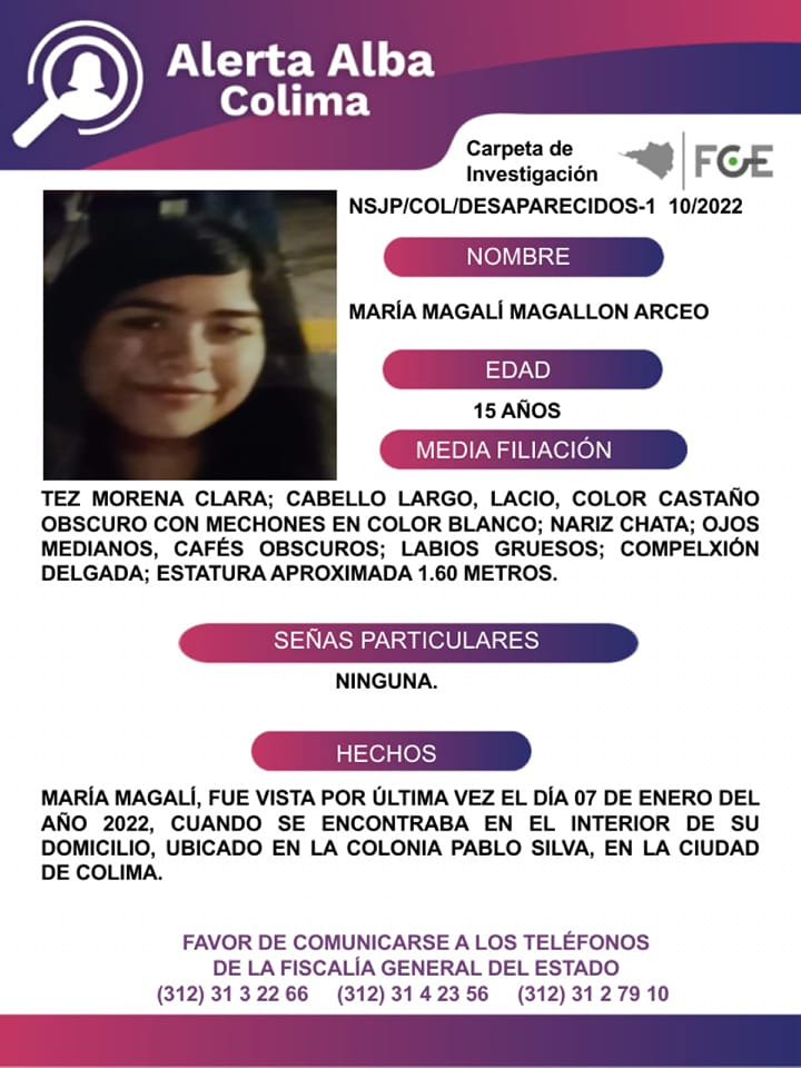 María Magaly Magallón Arceo tiene 15 años de edad y fue vista por última vez el día 17 de enero de 2022, cuando se encontraba en el interior de su domicilio, ubicado en la colonia Pablo Silva en la ciudad de Colima. Es de piel morena clara; cabello largo, lacio, color castaño oscuro con mechones en color blanco; nariz chata; ojos medianos, cafés oscuros; labios gruesos; complexión delgada; mide aproximadamente 1.60 metros.