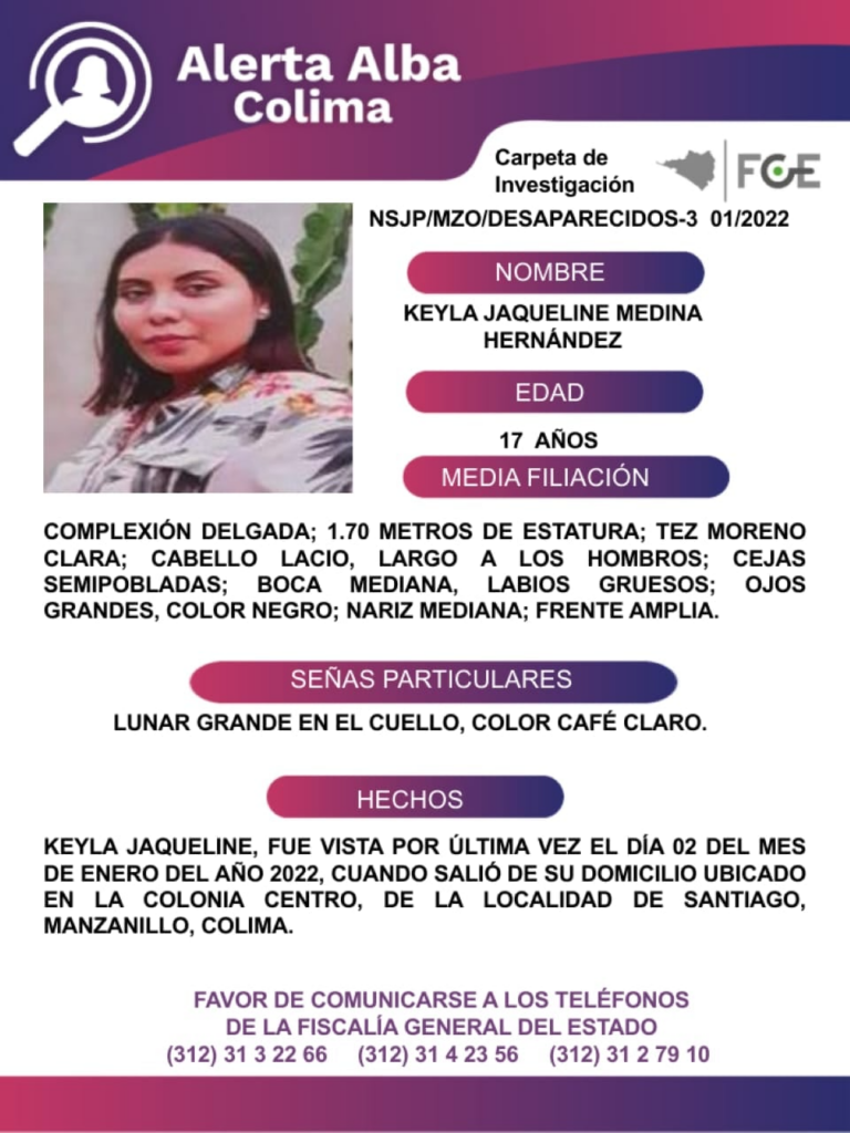 Keyla Jaqueline Medina Hernández tiene 17 años de edad y fue vista por última vez el día 2 de enero de 2022, cuando salió de su domicilio ubicado en la colonia Centro, de la localidad de Santiago, Manzanillo, Colima. Es de complexión delgada mide 1.70 metros de estatura, tiene piel morena clara, cabello lacio, largo, a los hombros; cejas semi pobladas, boca mediana, labios gruesos; ojos grandes, color negro, nariz mediana y frente amplia. Como señas particulares tiene un lunar grande en el cuello, color café claro.