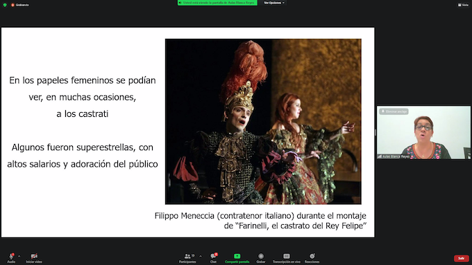 Por último, dijo que Farinelli persuadió al rey Fernando VI (hijo de Felipe V), de establecer la ópera italiana en España. Dirigió el Colegio Real de Santa Bárbara de Niños Músicos conocido como “Casa de los Capones” en España, y además de cantante fue compositor e instrumentista. Para ilustrar la interpretación y el momento histórico de este cantante, la catedrática proyectó algunas escenas de la película Farinelli de 1994, la cual recomendó a las y los asistentes.
