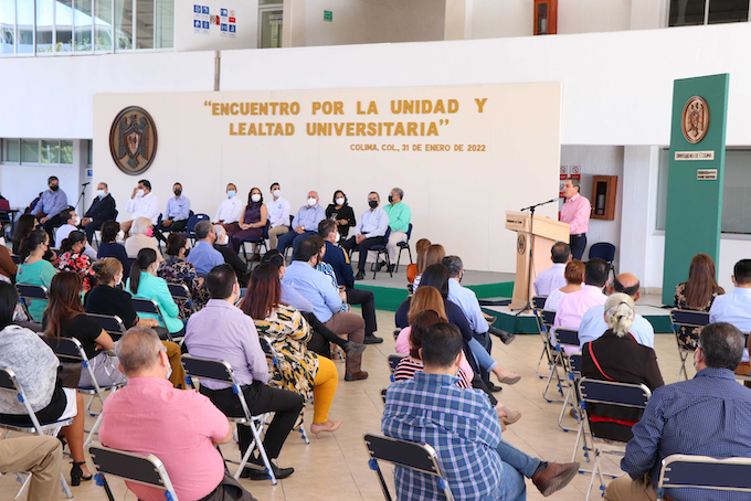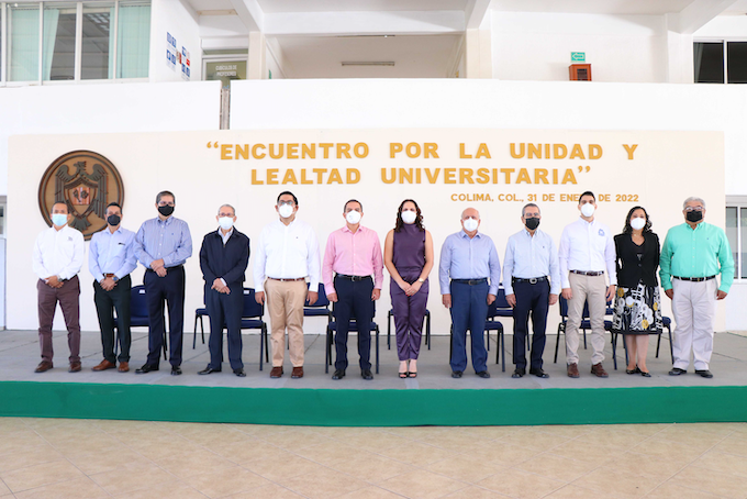 Colima, México, Comunicado (01/02/2022).- Con la presencia de directivos y autoridades universitarias encabezadas por el rector Christian Jorge Torres Ortiz Zermeño, así como de ex rectores y líderes de los sectores universitarios, este lunes la Universidad de Colima celebró el Encuentro por la Unidad y la Lealtad Universitaria, una tradición que cumple 33 años, comentó el rector, “de expresar ante nuestros compañeros, los estudiantes y la sociedad colimense, la convicción de trabajar unidos en un proyecto común”.