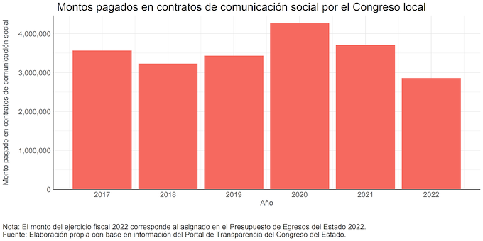 De igual manera, en la casa del pueblo, el presupuesto público es ejercido en un entorno de opacidad y discrecionalidad. De acuerdo con información del portal de transparencia, en los últimos 6 años (considerando el 2022), el Congreso local acumula montos pagados superiores a veinte millones de pesos en contratos de comunicación social, mismos que han sido asignados sin criterios explícitos basados en la imparcialidad y sin mecanismos de evaluación y rendición de cuentas. Los montos no son menores, el acumulado equivale a más de tres veces el presupuesto asignado para este ejercicio fiscal a la subsecretaría de las juventudes, a la escuela de talentos o al instituto para la atención de adultos mayores. Y supera el monto destinado a derechos humanos, al instituto colimense de las mujeres o a programas como el de uniformes escolares o de entrega de apoyos alimentarios, para este mismo año. El mal manejo y asignación de este tipo de recursos ocurre en detrimento de proyectos destinados a resolver problemas públicos en la entidad y afecta la independencia y calidad de la información.