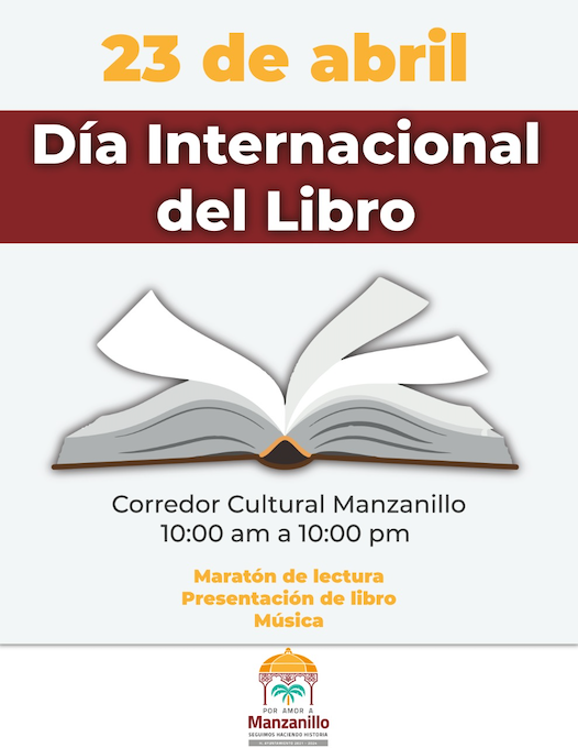 El 23 de abril en el Corredor Cultural se montará una exposición fotográfica de la Dirección de Archivo Histórico; a las 10 de la mañana se realizará una bienvenida para después iniciar con la charla “La importancia de celebrar el día internacional del Libro”, después de 11 a 11:50 de la mañana se presentará el libro: Miradas a la discriminación, a cargo del maestro Rafael Antonio Solorio Figueroa, Coordinador del Sistema Municipal de Justicia Cívica del Ayuntamiento de Manzanillo.