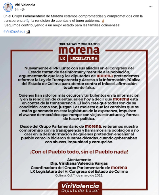 El día de ayer desplegaron en sus muros de la red social Facebook un comunicado, en el que refieren que es falso que los Diputados de Morena pretendan reformar la Ley de Transparencia y Acceso a la Información Pública del Estado de Colima para atentar contra el Infocol, así como que reiteran su compromiso con la transparencia y hacen un llamado a la población a no caer en la desinformación de quienes pretenden engañar al pueblo. A continuación, se presenta ese desplegado:
