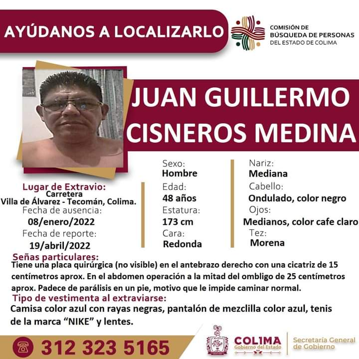 Juan Guillermo Cisneros Medina tiene 48 años de edad, piel morena, cara redonda, mide 1.73 metros de estatura y desapareció cuando viajaba de Villa de Álvarez a Tecomán.