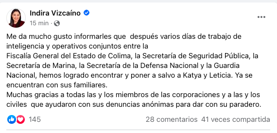 Este domingo, al filo de las 4:45 horas, la gobernadora de Colima, Indira Vizcaíno Silva informó mediante sus redes sociales, la localización de Leticia Josefina Saucedo Lara y Katya Yuleni Rodríguez Mejía, según su publicación fueron localizadas con bien y ya están de regreso con su familia.
