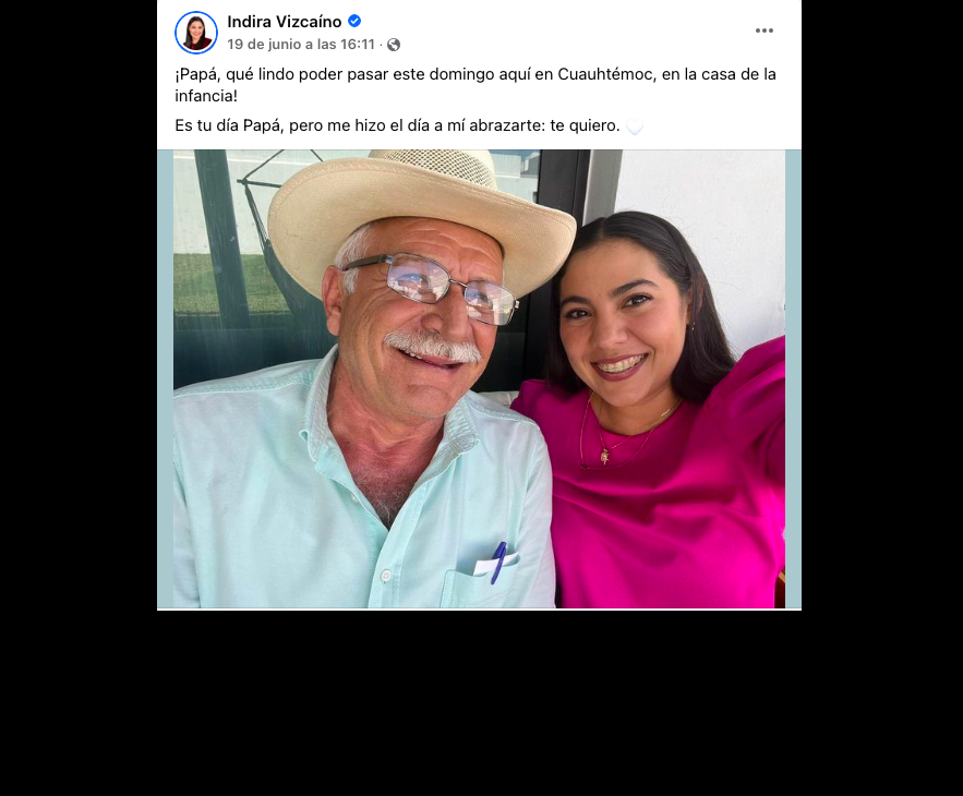 En su red social, la gobernadora acompañó su fotografía familiar con un mensaje donde se congratulaba de haber regresado a la casa de su infancia en el municipio de Cuauhtémoc de donde es originaria y subrayó que aunque era el día del padre, a ella se le había hecho el día el abrazar a su progenitor.