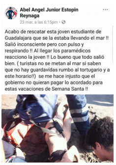 El día 24 de marzo por la tarde el joven Abel Ángel Estopin Reynaga rescató en la playa de Cuyutlán a una joven que estuvo a punto perecer. Se hizo notable que no había guardavidas donde ella nadó y que había desacuerdo con relación al pago por el servicio que prestan los guardavidas.