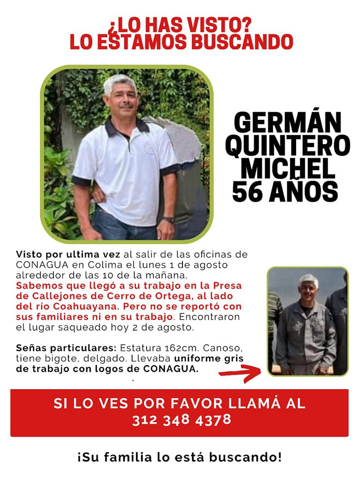 “Sabemos que llegó a su trabajo en la Presa de Callejones de Cerro de Ortega, al lado del río Coahuayana. Pero no se reportó con sus familiares ni en su trabajo. Encontraron el lugar saqueado hoy 2 de agosto”, dice en una imagen que compartieron en redes sociales.