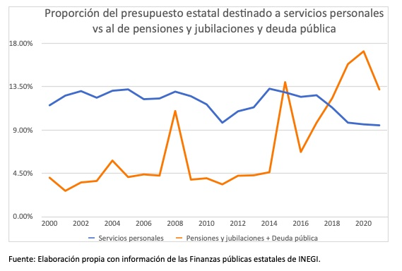 Por otro lado, la trayectoria del gasto muestra el debilitamiento de la administración pública en rubros que inciden en sus capacidades. El gasto en servicios personales (nómina) representó en 2021 la proporción más baja del presupuesto desde el año 2000, al representar 9.50 % del presupuesto total. Incluso, al comparar la evolución de la proporción del presupuesto destinado a pensiones y jubilaciones más deuda pública este ya supera al de servicios personales. Así, en 2021 el presupuesto en servicios personales representó 9.50 %, mientras que el de deuda pública y pensiones y jubilaciones fue en conjunto de 13.22 %. Dicha distribución y evolución del gasto va en detrimento de las capacidades de la administración pública y muestra una tendencia que a futuro presionará en mayor medida las finanzas públicas estatales.