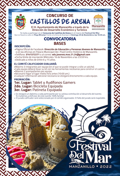 Sobre el concurso de Castillos de Arena, se podrán hacer equipos de 3 al que se podrá integrar 1 adulto. Cada equipo deberá llevar su kit con las herramientas necesarias para construir un castillo, la cita es llegar media hora antes del evento (10 de la mañana) y cada equipo podrá llevar dos acompañantes, las bases de este concurso pueden consultarse en el siguiente enlace: https://manzanillo.gob.mx/almacen/CONVOCATORIA_FESTIVAL%20DEL%20MAR%202022_CATILLOS%20DE%20ARENA.jpeg o en las redes sociales del Ayuntamiento de Manzanillo.