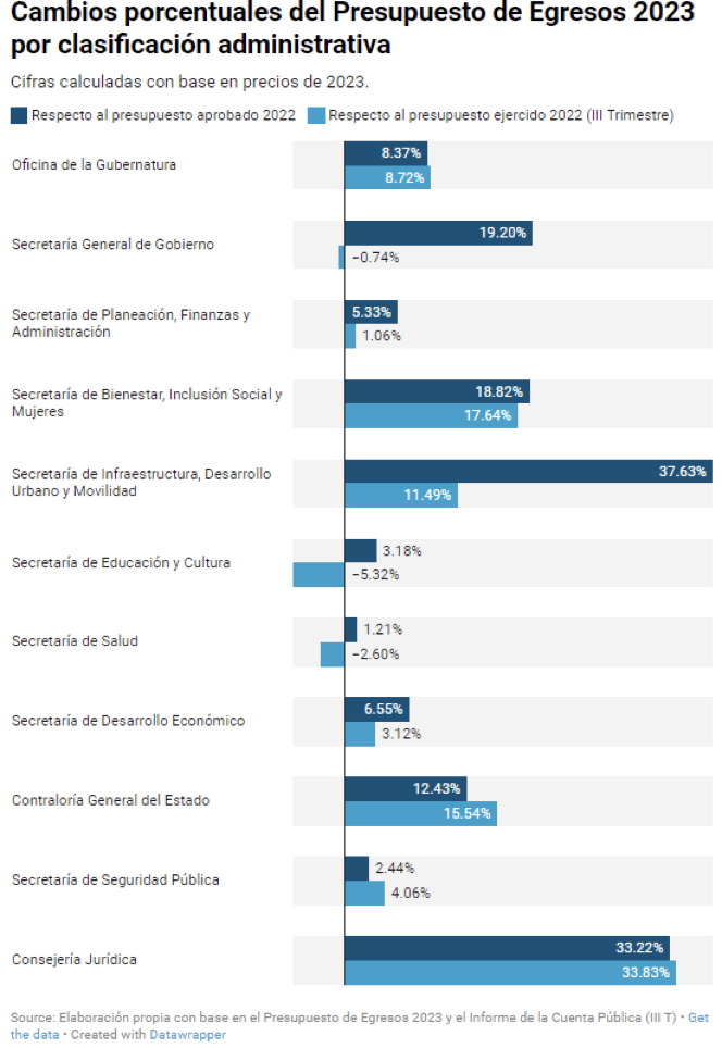 Así, el Presupuesto de Egresos 2023 muestra que Educación, Salud y Seguridad no son prioridades del gobierno estatal (al ser las áreas menos fortalecidas o más afectadas). Si comparamos el PEE-2023 con lo aprobado en 2022, las dependencias fortalecidas son la Secretaría de Infraestructura (+ 37.63 %), la Consejería Jurídica (+33.22 %) y la Secretaría General de Gobierno (+19.20 %), mientras que Educación (+3.18 $), Salud (+ 1.21%) y Seguridad (+2.44 %) son las que reciben menos recursos (proporcionalmente). Pero si se compara el nuevo Presupuesto con la manera en que el gobierno del estado ha ejercido efectivamente los recursos en este año (y como pretende terminarlo), las áreas fortalecidas son la Consejería Jurídica (+ 33.83 %), la Secretaría de Bienestar (+17.64 %) y la Contraloría General (+15.54 %); y las perjudicadas, Educación (-5.32 %), Salud (-2.60 %) y General de Gobierno (-0.74 %). Así, a pesar de que existe un aumento en la cantidad total de recursos, el presupuesto de este año realiza reacomodos que benefician y perjudican de manera diferenciada a las dependencias de la administración pública.