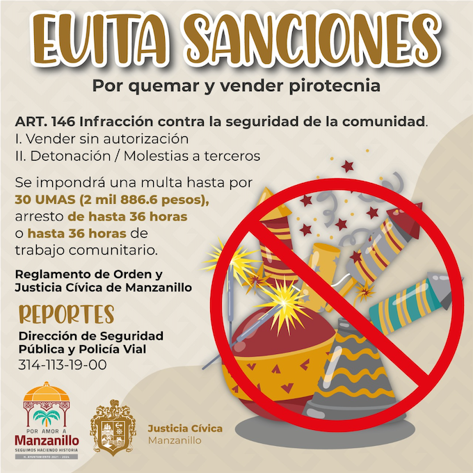 Ayuntamiento de Manzanillo advierte sanciones por usar o comercializar pirotecnia sin permiso