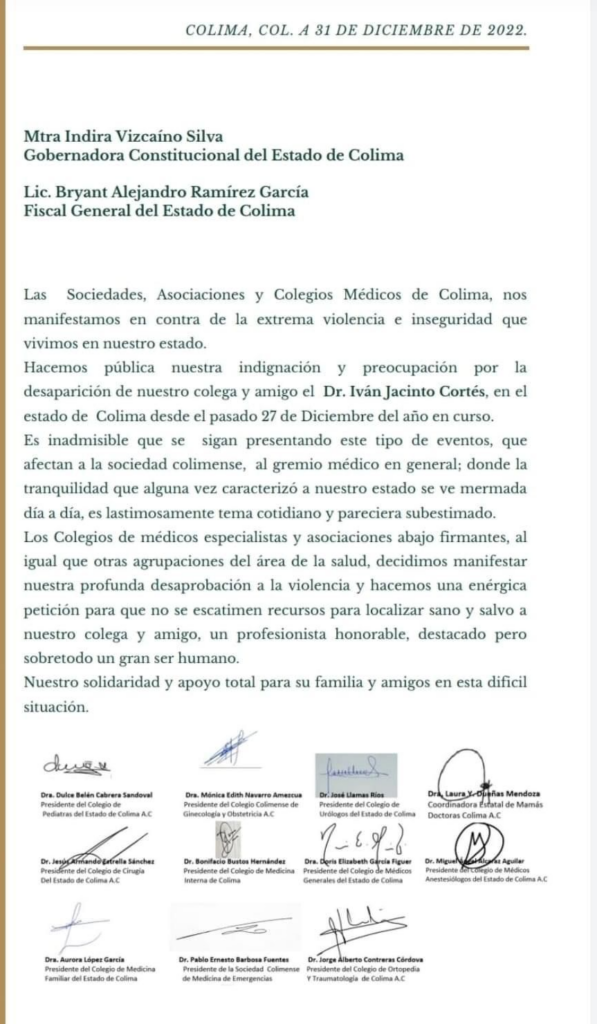 En un documento firmado por presidentes de las mismas, hicieron pública su indignación y preocupación por la desaparición del Dr. Iván Jacinto Cortés, el pasado 27 de diciembre. Destacaron que es inadmisible que se sigan presentando este tipo de eventos, además, consideraron lastimoso que la autoridad subestime la problemática.
