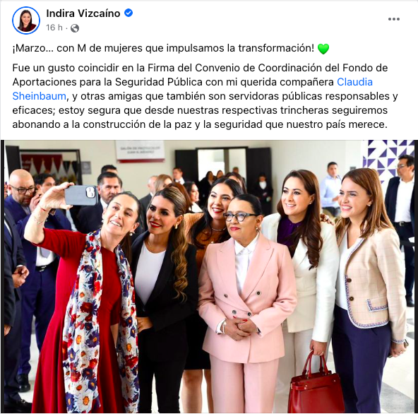 Mientras esto sucedía en Colima, en la Ciudad de México la gobernadora Indira Vizcaíno Silva firmaba un Convenio de Coordinación del Fondo de Aportaciones para la Seguridad Pública y por supuesto, aprovechó para tomarse una fotografía con su “querida compañera Claudia Sheinbaum, y otras amigas que también son servidoras públicas responsables y eficaces; estoy segura que desde nuestras respectivas trincheras seguiremos abonando a la construcción de la paz y la seguridad que nuestro país merece”, dijo.