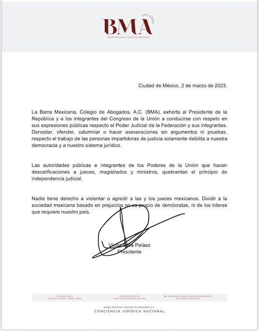 La BMA agrega “Las autoridades políticas e integrantes de los Poderes de la Unión que hacen descalificaciones a los jueces, magistrados y ministros, quebranta el principio de independencia judicial.”