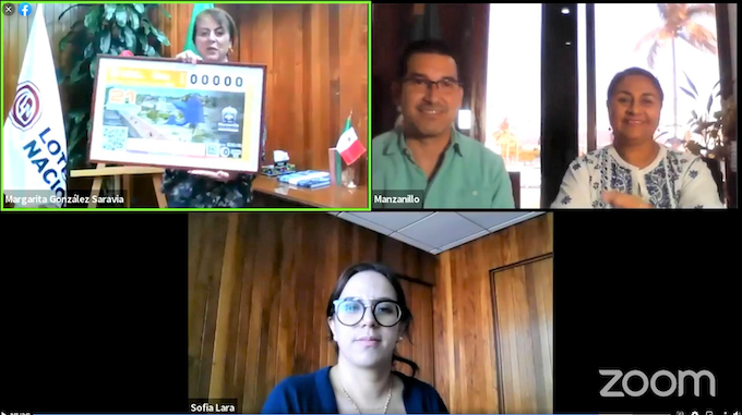 Manzanillo, México, Comunicado (08/03/2023).- El Sorteo 3 mil 879 de la Lotería Nacional dedicado a la ciudad y puerto de Manzanillo, que jugará para el 14 de marzo de 2023, fue develado por la directora general de ese organismo de asistencia pública, Margarita González Saravia, a través de una ceremonia digital, en la que estuvo presente la alcaldesa Griselda Martínez, quien dijo que de esa forma, se promociona turística y comercialmente al municipio sin ningún costo para las arcas públicas.