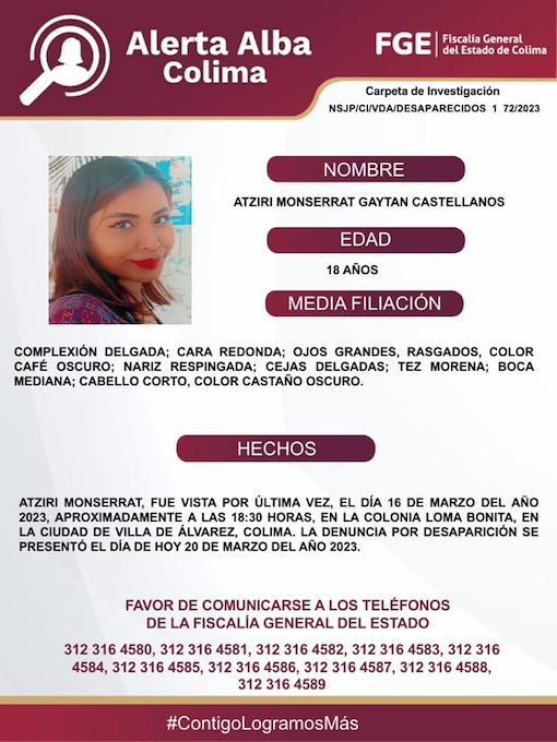 Colima, México, Avanzada (24/03/2023).- La Fiscalía General del Estado de Colima activó una Alerta Alba por la desaparición de Atziri Monserrat Gaytán Castellanos, una joven de 18 años de edad, que fue vista por última vez el pasado 16 de marzo en la colonia Loma Bonita, en la ciudad de Villa de Álvarez, Colima.