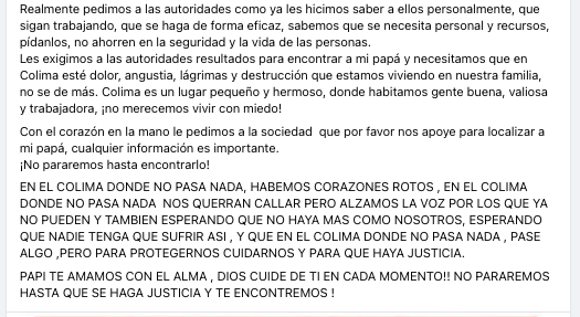 La Doctora espera que no haya más personas sufriendo de esta forma en Colima y exige que haya justicia. En una declaración final, la familia declara su amor por su padre y su compromiso para encontrarlo: “¡No pararemos hasta encontrarlo!”.