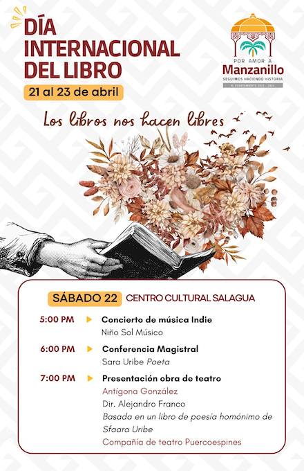 El sábado 22 de abril, en el Centro Cultura de Salagua se llevarán a cabo las siguientes actividades: A las 5 de la tarde, concierto de música Indie, por el músico Niño Sol. A las 6 de la tarde, la poetisa Sara Uribe, dictará conferencia magistral. A las 7 de la tarde, la compañía de teatro “Puercoespines”, bajo la dirección de Alejandro Franco, presenta la obra de teatro “Antígona González”, basada en un libro de poesía homónimo de Sara Uribe.
