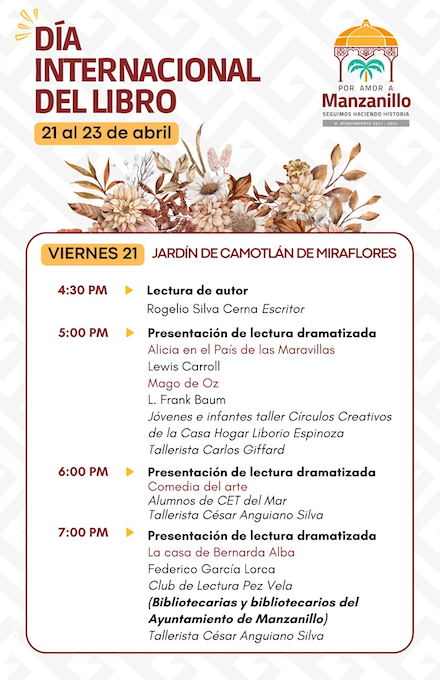 Las actividades culturales darán inicio el viernes 21 de abril en la comunidad de Camotlán de Miraflores: A las 4:30 de la tarde, lectura con el escritor Rogelio Silva Cerna. A las 5 de la tarde, presentación de la lectura dramatizada: “Alicia en el País de las maravillas” de Lewis Carroll, con los invitados: jóvenes e infantes de taller Círculos Creativos de la Casa Hogar “Liborio Espinoza” y el tallerista Carlos Giffard. De 6:00-7:00 pm lectura dramatizada: “Mago de Oz” de L. Frank Baum, a cargo de alumnos de CET del Mar con el tallerista César Anguiano Silva. De 7:00 9:00 de la noche, la presentación de Lectura dramatizada: “La casa de Bernarda Alba”, de Federico García Lorca, a cargo del Club de Lectura Pez Vela -Bibliotecarias y bibliotecarios del Ayuntamiento de Manzanillo-, con el tallerista César Anguiano Silva.