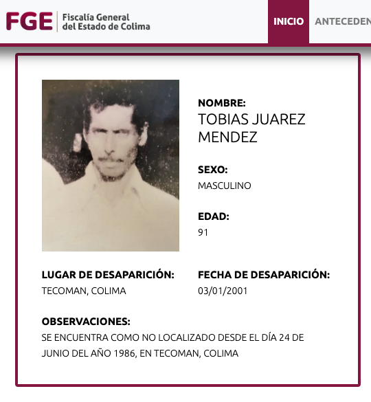 El apartado de personas desaparecidas indica que Tobías tendría 91 años de edad y se encuentra como no localizado desde el 24 de junio de 1986, ocurrió en el municipio de Tecomán, Colima. Se registró con estatus de desaparecido el 03 de enero de 2001.