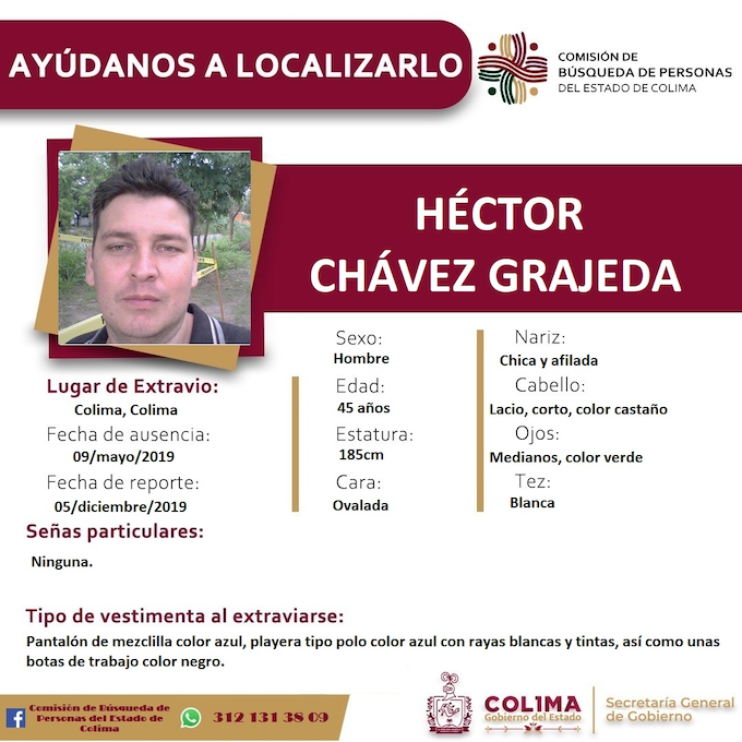Se solicita a la ciudadanía que, si cuenta con información que pueda ayudar a encontrar a Héctor, se ponga en contacto con la Comisión de Búsqueda de Personas del Estado de Colima o con la Secretaría General de Gobierno.