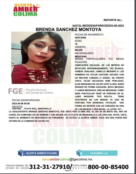 Colima, México, Avanzada (09/05/2023).- La adolescente Brenda Sánchez Montoya fue vista por última vez el día 06 de mayo del año en curso, en compañía de un hombre y una mujer en la playa de Manzanillo a un lado del Hotel Vista. Hasta el momento se desconoce su paradero, por lo que se ha activado la Alerta Amber, toda vez que puede ser víctima de la comisión de un delito.
