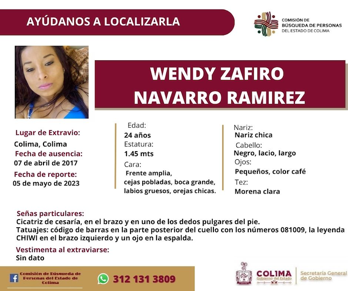 Colima, México, Avanzada (09/05/2023).- La Comisión de Búsqueda de Personas del Estado de Colima emitió un comunicado en el que solicita la ayuda ciudadana para localizar a Wendy Zafiro Navarro Ramírez, quien desapareció el 7 de abril de 2017 en Colima, Colima.