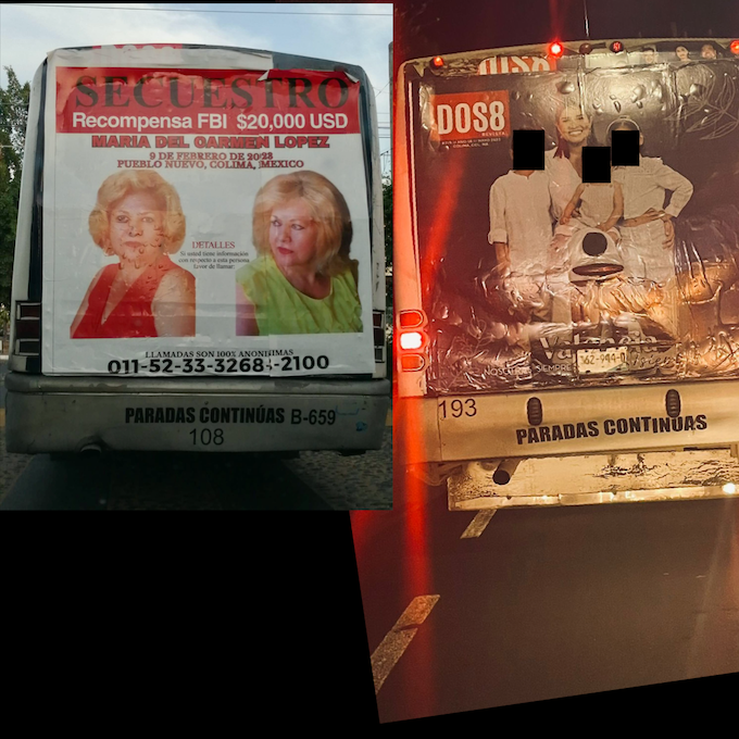 También en las unidades de transporte que circulan en Colima y Villa de Álvarez, aparece un vinil con la fotografía de María del Carmen López, una mujer secuestrada el 9 de febrero en su casa en Pueblo Nuevo, Villa de Álvarez.