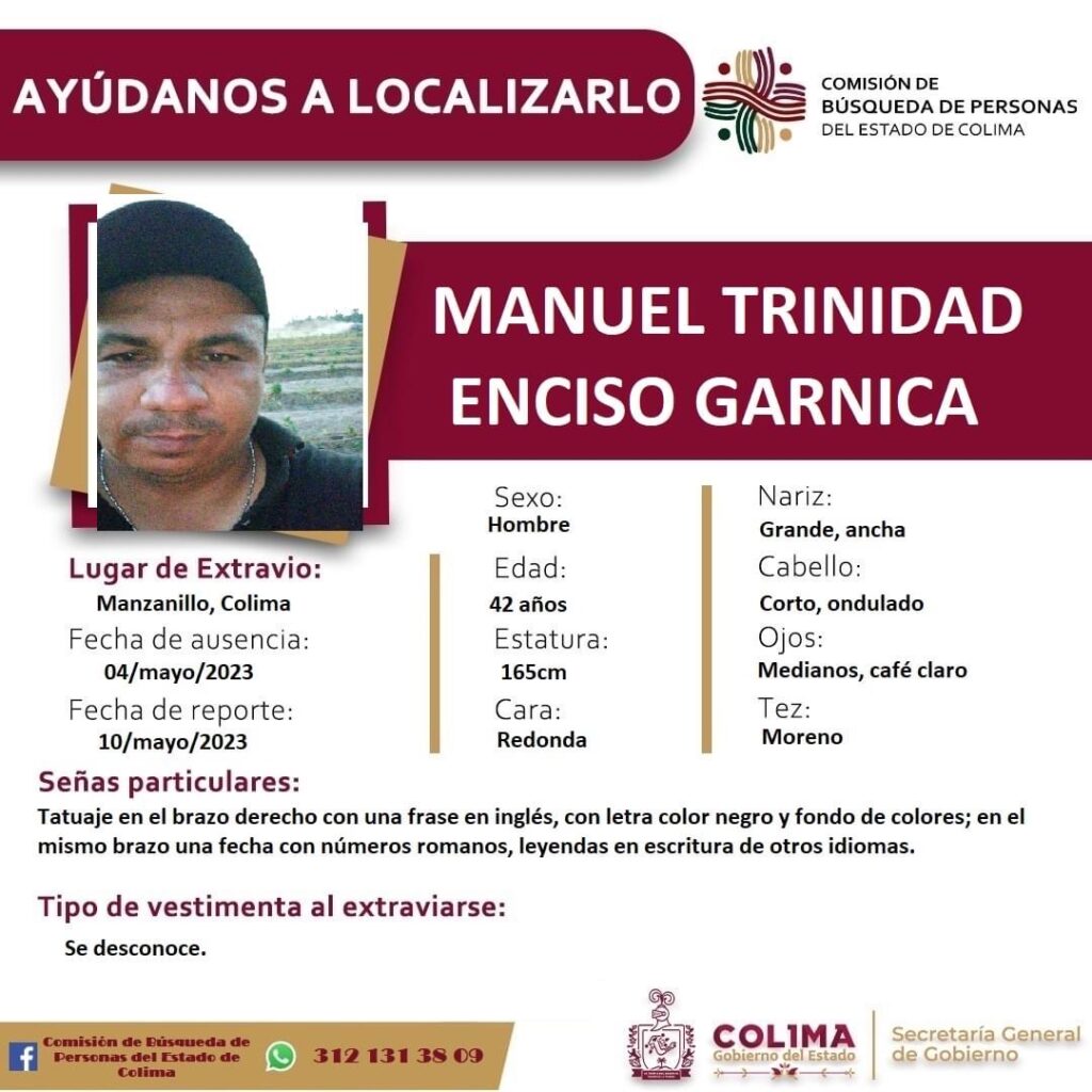 Se desconoce su vestimenta al momento de su desaparición y la denuncia por su ausencia se realizó el 10 de mayo de 2023. Ante esto, se solicita a la población que cualquier información que puedan proporcionar sobre el paradero de Manuel Enciso Garnica, sea comunicada a la Comisión de Búsqueda de Personas del Estado de Colima al teléfono 312 131 38 09.