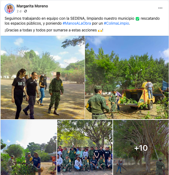 En cambio, en su red social de Facebook, la presidenta Margarita Moreno exhibe fotografías de elementos de la SEDENA, cortando ramas y barriendo, lo que generó críticas entre las personas que comentaron la publicación: “Cuando no hay para nómina y tomas mano de obra de gobierno federal como SEDENA, que por estar limpiando y haciendo quedar bien a las autoridades del municipio desatienden la problemática de seguridad del estado, ellos no deberían de estar limpiando deben de estar patrullando calles haciendo labor de investigación tirando balas contra malos etc., limpiar que lo hagan los civiles lástima”, escribió Julio Cesar Castillo Macias.