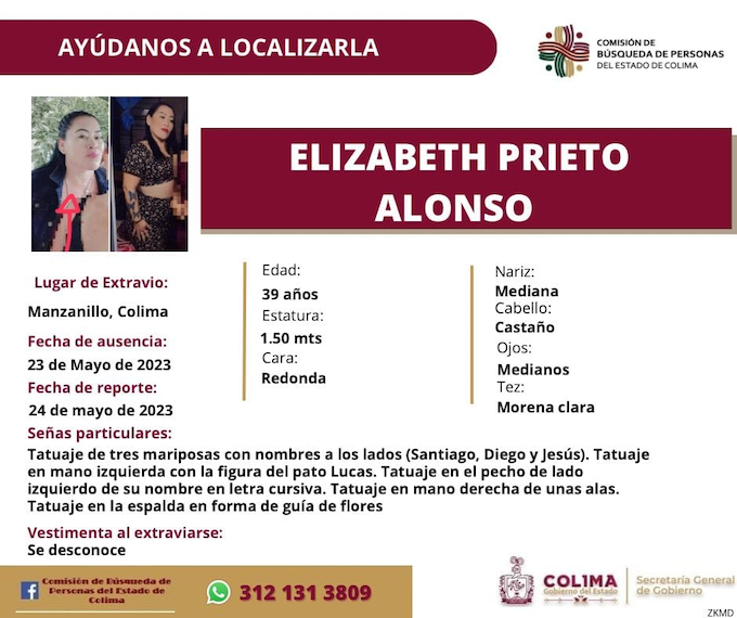 Colima, México, Avanzada (24/05/2023).- La Comisión de Búsqueda de Personas del Estado de Colima emitió un comunicado urgente solicitando la colaboración ciudadana para localizar a Elizabeth Prieto Alonso, de 39 años de edad, quien fue reportada como desaparecida el 23 de mayo de 2023.