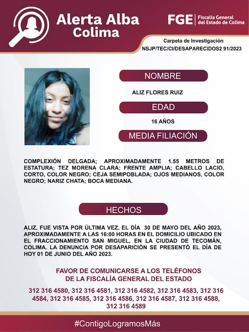 Colima, México, Avanzada (02/06/2023).- La Fiscalía General del Estado de Colima activó el protocolo Alerta Alba en busca de Aliz Flores Ruiz, una joven de 16 años que se encuentra desaparecida desde el pasado 30 de mayo.
