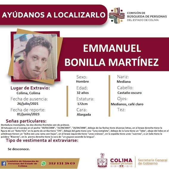 Colima, México, Avanzada (03/06/2023).- La Comisión de Búsqueda de Personas del Estado de Colima solicita la colaboración de la comunidad para encontrar a Emmanuel Bonilla Martínez, un hombre de 32 años que desapareció el 26 de julio de 2021 en la ciudad de Colima, Colima.