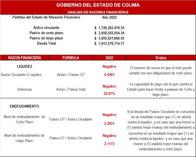 En deudas por pagar a corto plazo, el gobierno reporta pasivos por mil 980 millones de pesos y en el 2022 fueron 3 mil 466 millones de pesos. En el documento no se especifica el movimiento financiero que realizó el gobierno para disminuir los pasivos a corto plazo entre 2022 y 2023.