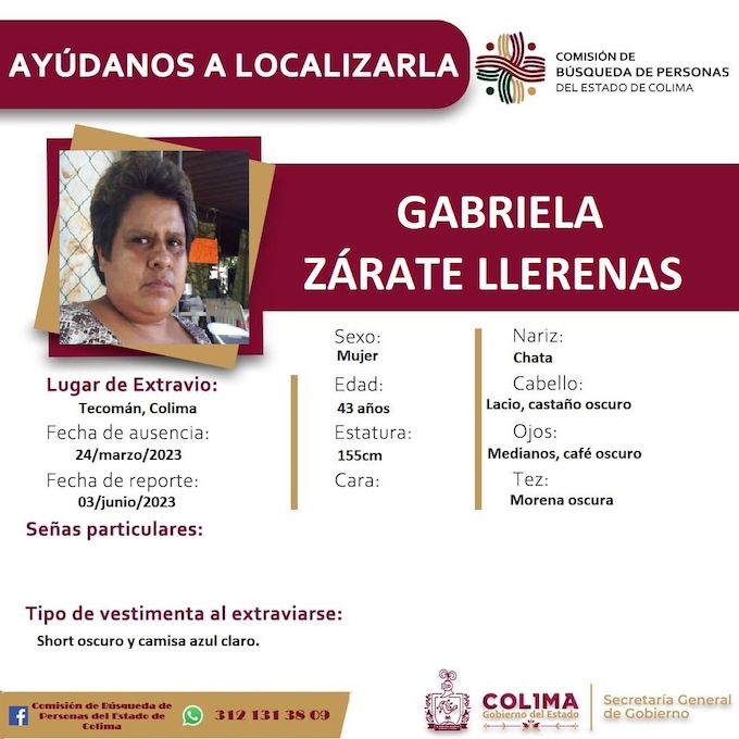 En caso de tener cualquier información sobre el paradero de Gabriela Zarate Llerenas, se solicita que se comunique de inmediato a la Comisión de Búsqueda de Personas del Estado de Colima al número 312 131 38 09.