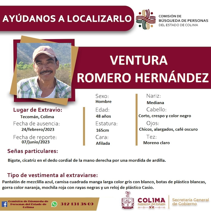 La Comisión de Búsqueda de Personas del Estado de Colima solicita a cualquier persona que tenga información sobre el paradero de Ventura Romero Hernández que se comunique al siguiente número de contacto: 312 131 38 09. Cualquier dato o pista que pueda ayudar en la localización de esta persona es de vital importancia.